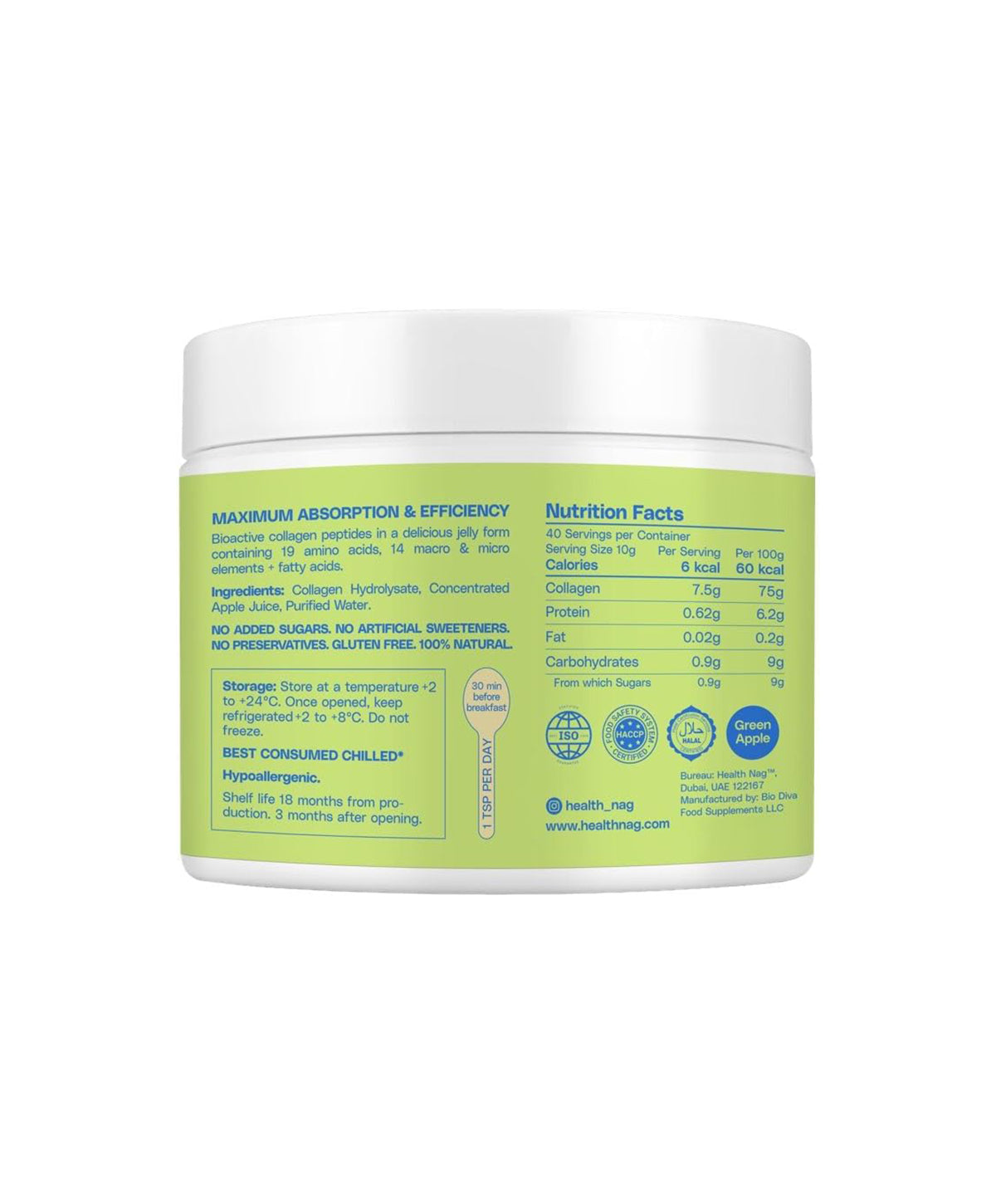 Boost your wellness routine with HealthNag Bioactive Collagen Gel, featuring collagen peptides of types I, II, and III in their highest bioavailable form. Halal certified and produced using high-pressure pasteurization technology, this collagen remains fully intact for maximum effectiveness. This innovative formula, enriched with natural elastin, ensures superior absorption and efficiency, offering a 100% natural and hypoallergenic supplement.