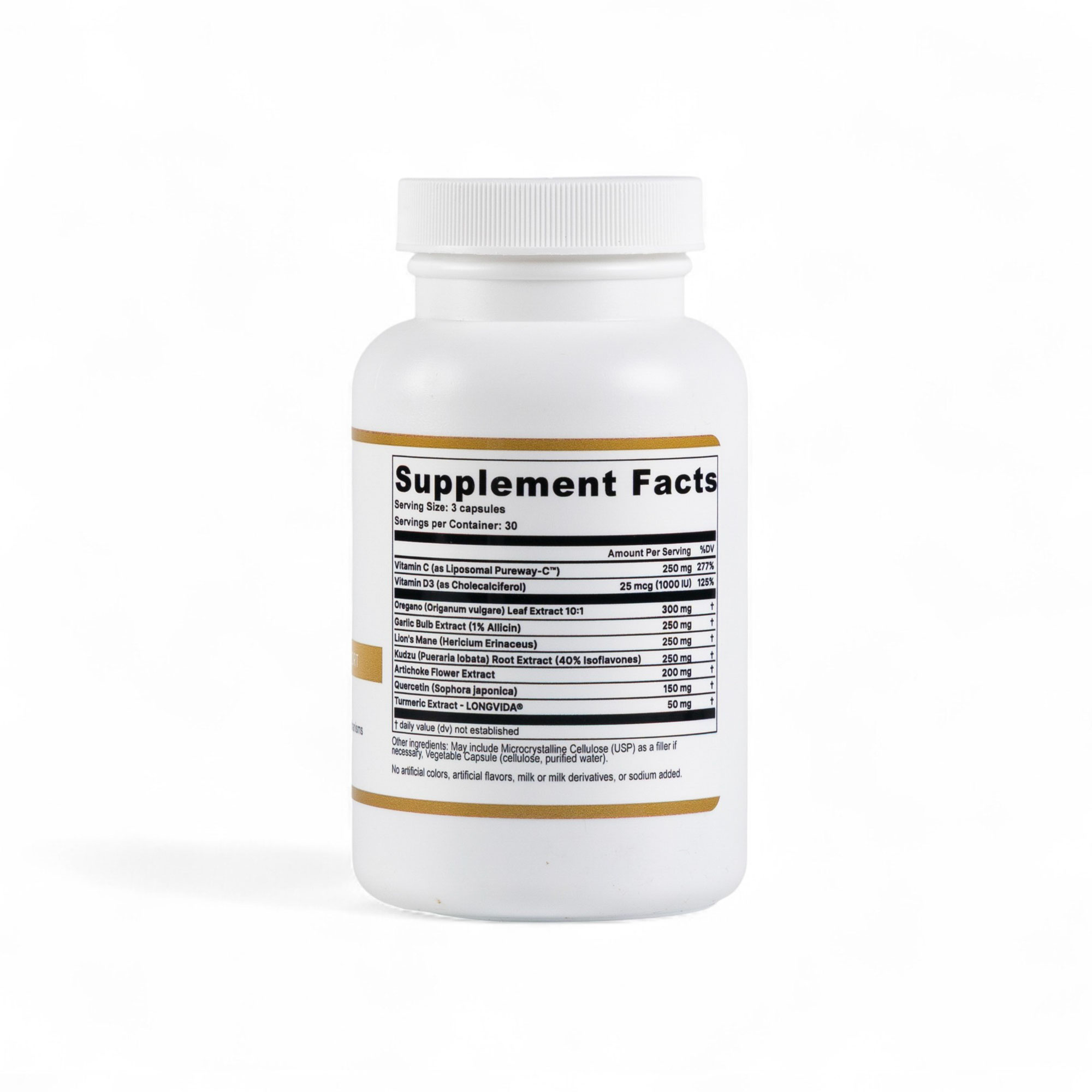 Virase™is a targeted immune-modulating stack designed to strengthen mucosal and systemic defenses using evidence-based botanicals and clinically supported actives. It combines quercetin, a well-studied flavonol that supports mast-cell stability and antiviral signaling; Vitamin D3, essential for innate immune activation; and high-potency LONGVIDA® optimized curcumin, a patented form of turmeric shown to achieve significantly higher brain and plasma bioavailability for controlling inflammatory and oxidative pathways relevant to immune resilience. The Virase™ stack also incorporates oregano leaf extract (10:1) and garlic standardized to allicin, both historically used for microbial balance; ginger (5% gingerols) and artichoke polyphenols for gut-immune axis support; kudzu isoflavones for inflammatory modulation; and Vitamin C for frontline antioxidant protection. Together, these ingredients form a multi-pathway defense system—supporting antiviral signaling, reducing inflammatory load, improving mucosal immunity, and enhancing metabolic resilience during immune stress—making Virase™ far more comprehensive than single-ingredient immune supplements typically found on the market